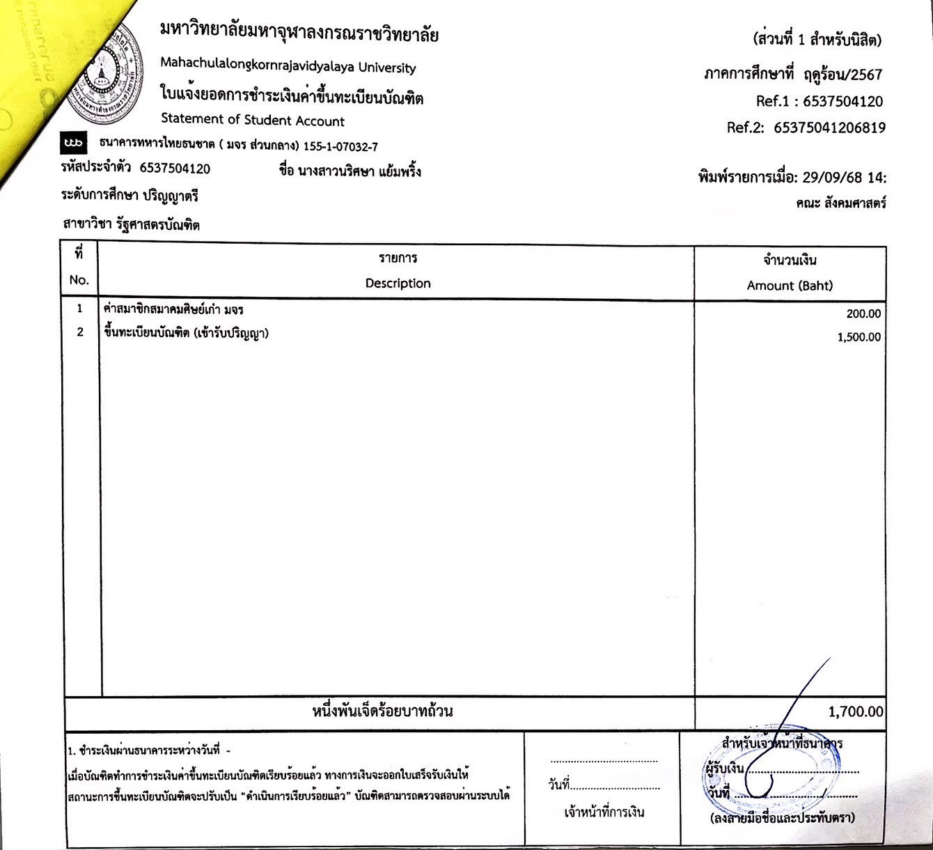| รหัสนิสิต : 6537504120 | ชื่อ : นางสาวนริศษา | ฉายา: - | นามสกุล: แย้มพริ้ง |