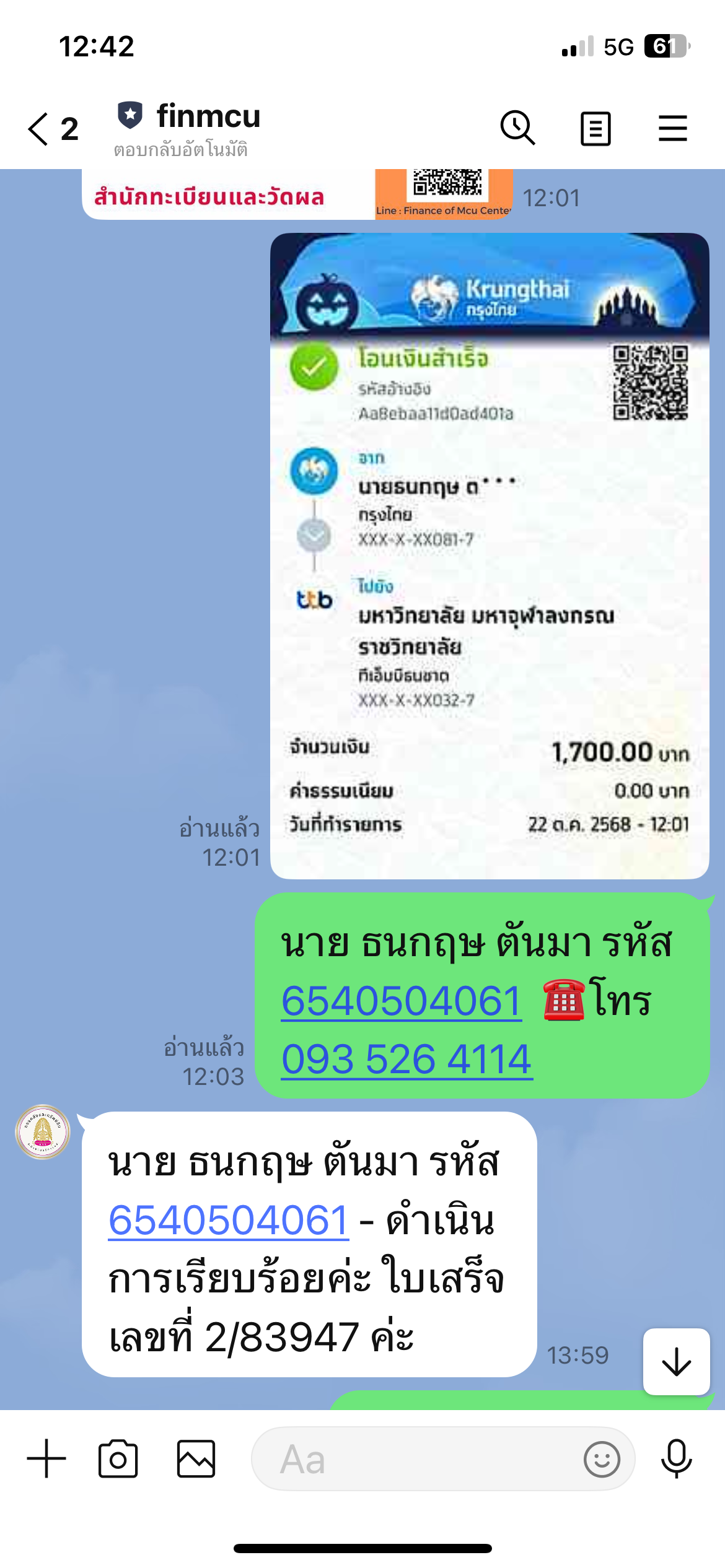 | รหัสนิสิต : 6540504061 | ชื่อ : นายธนกฤษ | ฉายา: - | นามสกุล: ตันมา |