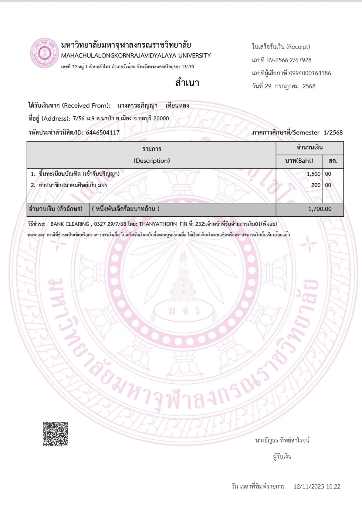 | รหัสนิสิต : 6446504117 | ชื่อ : นางสาวอภิญญา | ฉายา: - | นามสกุล: เทียนหลง |