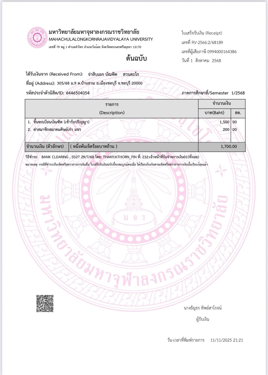 ใบเสร็จรับเงิน/เอกสารยืนยันการชำระเงิน(แนบเอกสาร)