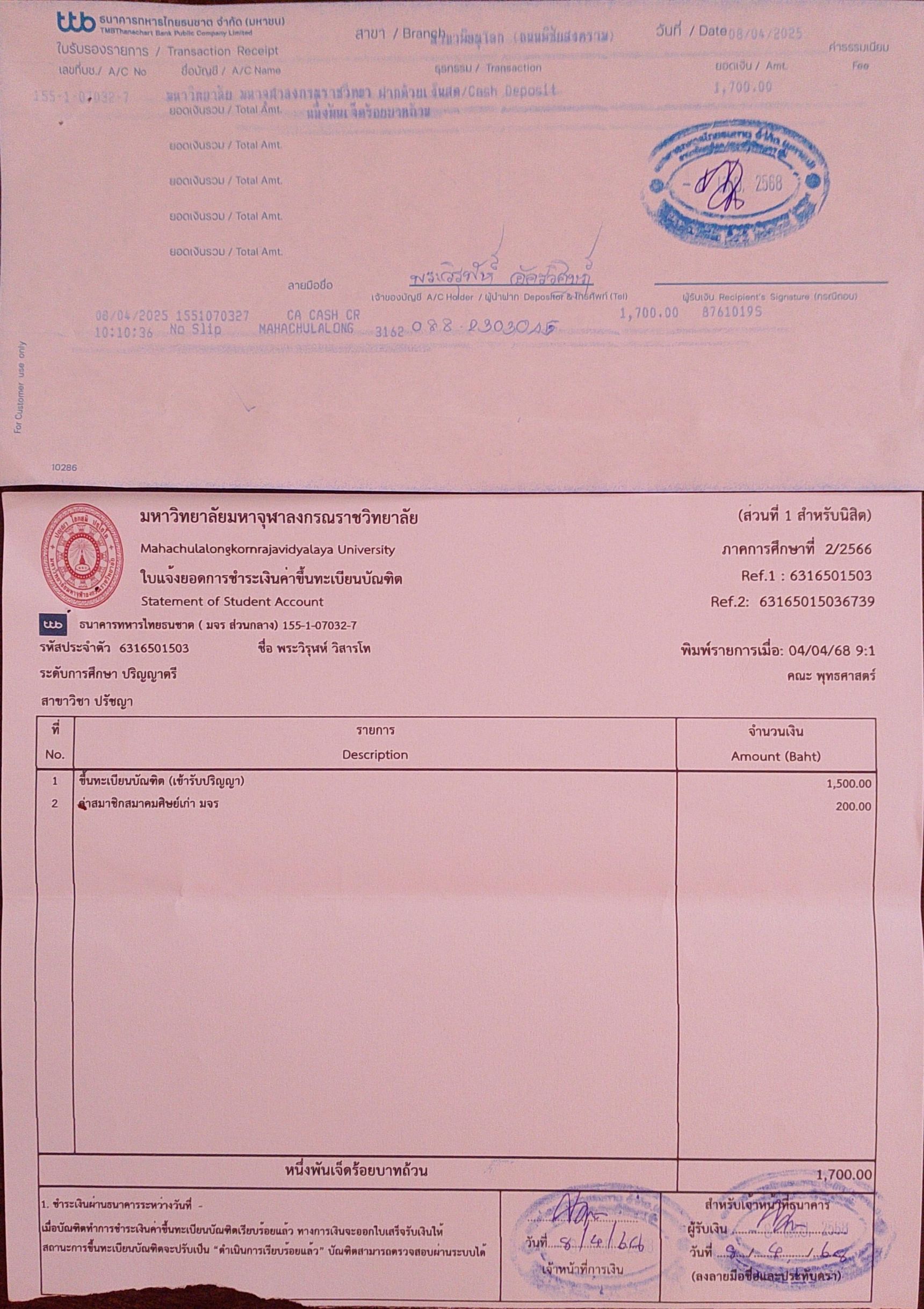 สถานะเข้าพิธีประสาทปริญญา : บรรพชิต ระดับ : ปริญญาตรี สังกัดคณะ: คณะพุทธศาสตร์ สาขาวิชา: ปรัชญา