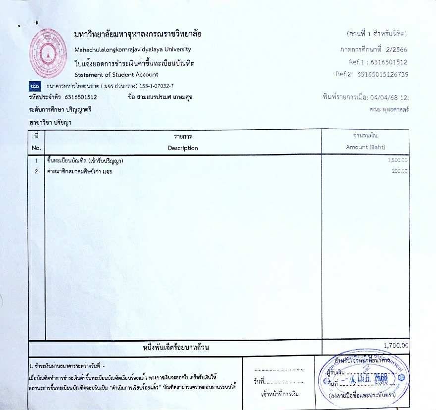 | สถานะเข้าพิธีประสาทปริญญา : บรรพชิต | ระดับ : ปริญญาตรี | สังกัดคณะ: คณะพุทธศาสตร์ | สาขาวิชา: ปรัชญา |
