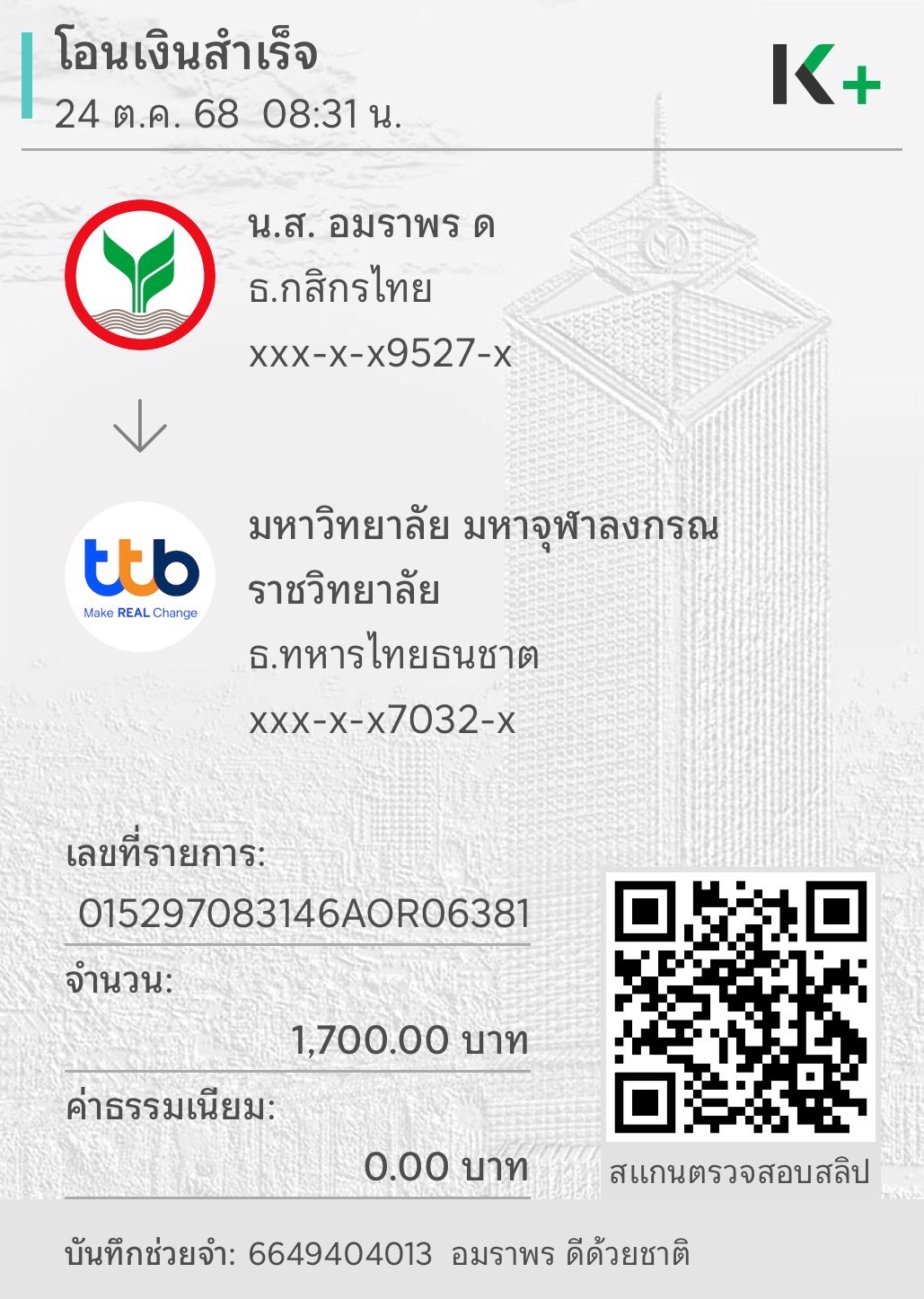 | รหัสนิสิต : 6649404013 | ชื่อ : นางสาวอมราพร | ฉายา: - | นามสกุล: ดีด้วยชาติ |