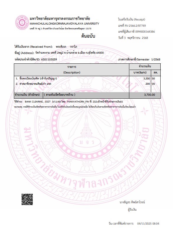 | รหัสนิสิต : 6501105059 | ชื่อ : พระดิเรก | ฉายา: วราโภ | นามสกุล: ม่วงทุ่ง |