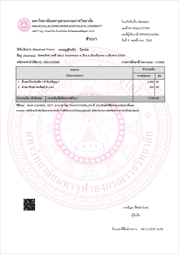 | สถานะเข้าพิธีประสาทปริญญา : บรรพชิต | ระดับ : ปริญญาเอก | สังกัดคณะ: บัณฑิตวิทยาลัย | สาขาวิชา: พุทธศาสตรดุษฎีบัณฑิต |