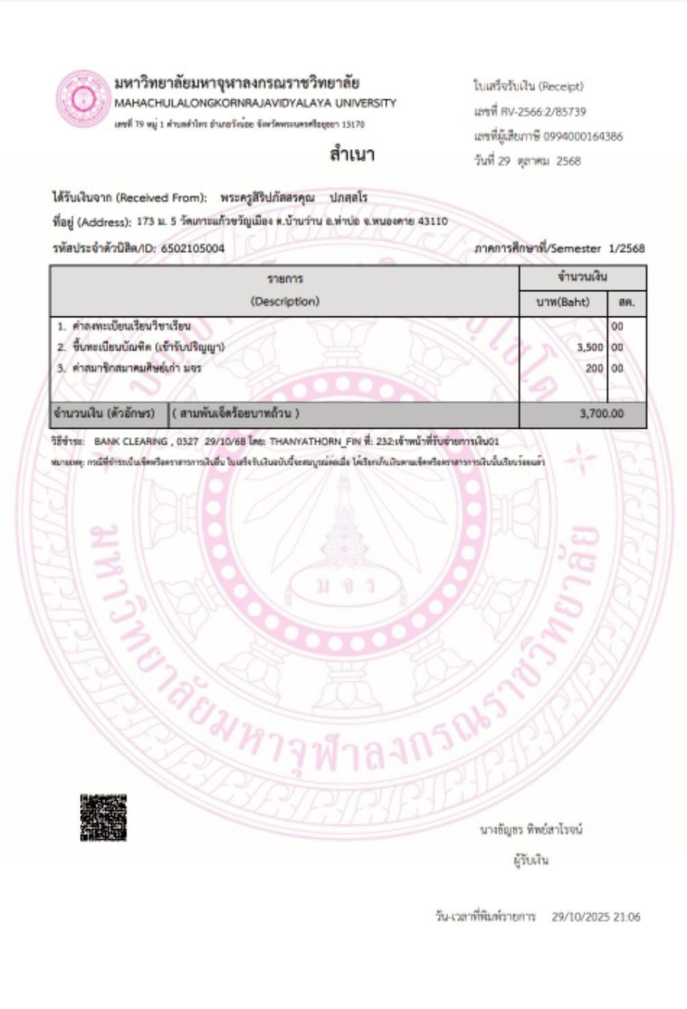 | รหัสนิสิต : 6502105004 | ชื่อ : พระครูสิริปภัสสรคุณ | ฉายา: ปภสฺสโร | นามสกุล: มีศรี |
