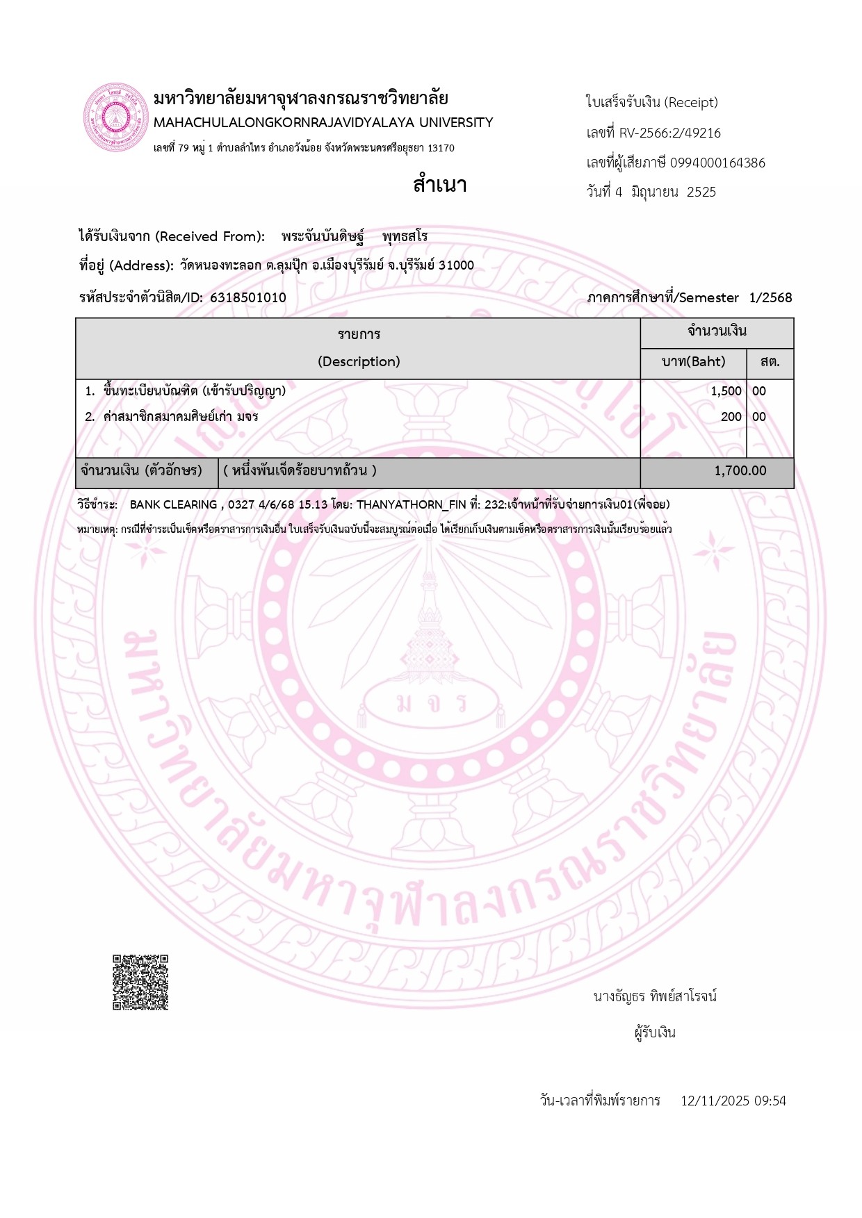 สถานะเข้าพิธีประสาทปริญญา : บรรพชิต ระดับ : ปริญญาตรี สังกัดคณะ: คณะพุทธศาสตร์ สาขาวิชา: พระพุทธศาสนา