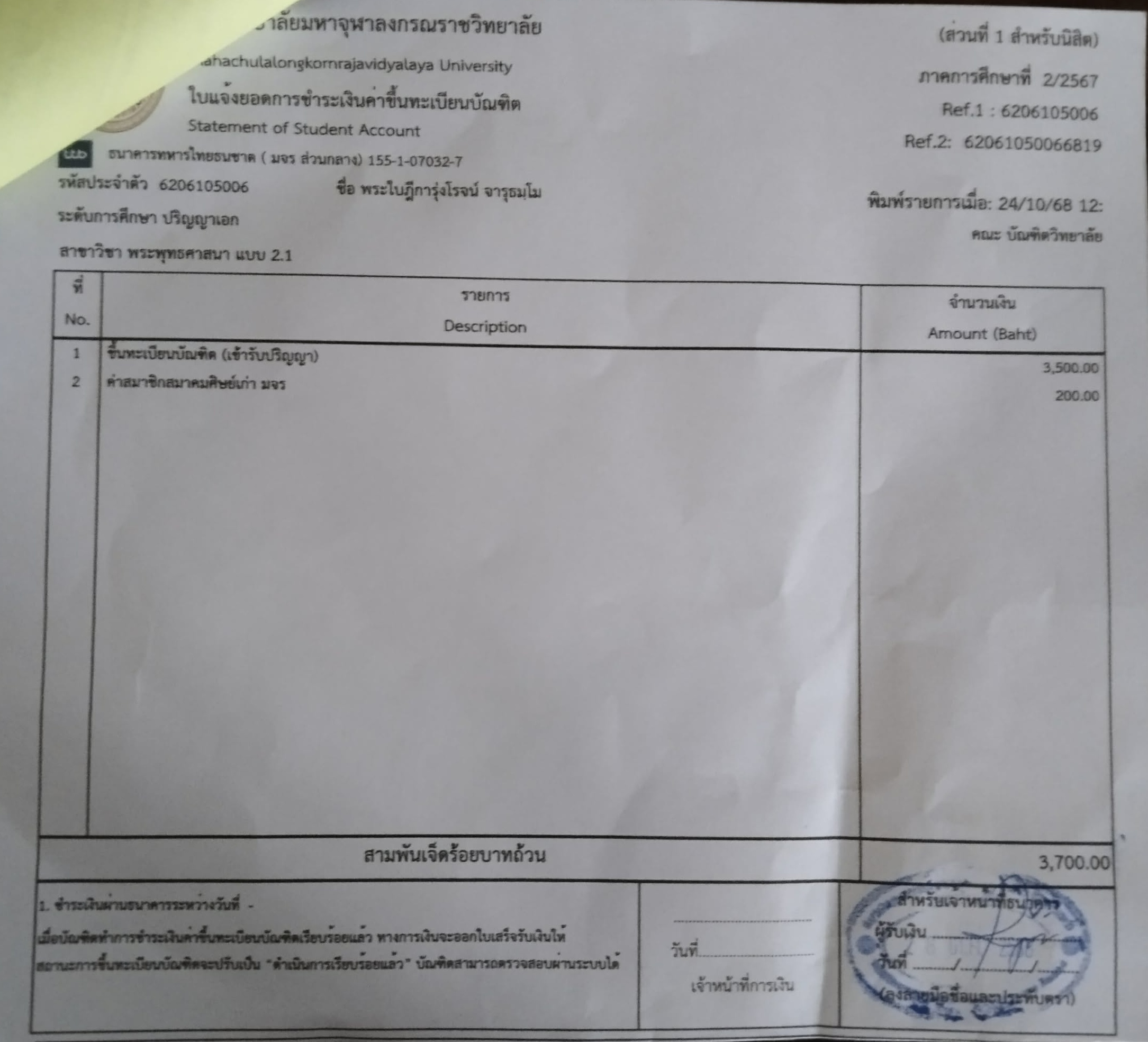 | รหัสนิสิต : 6206105006 | ชื่อ : พระใบฎีการุ่งโรจน์ | ฉายา: จารุธมฺโม | นามสกุล: เก่งกระโทก |