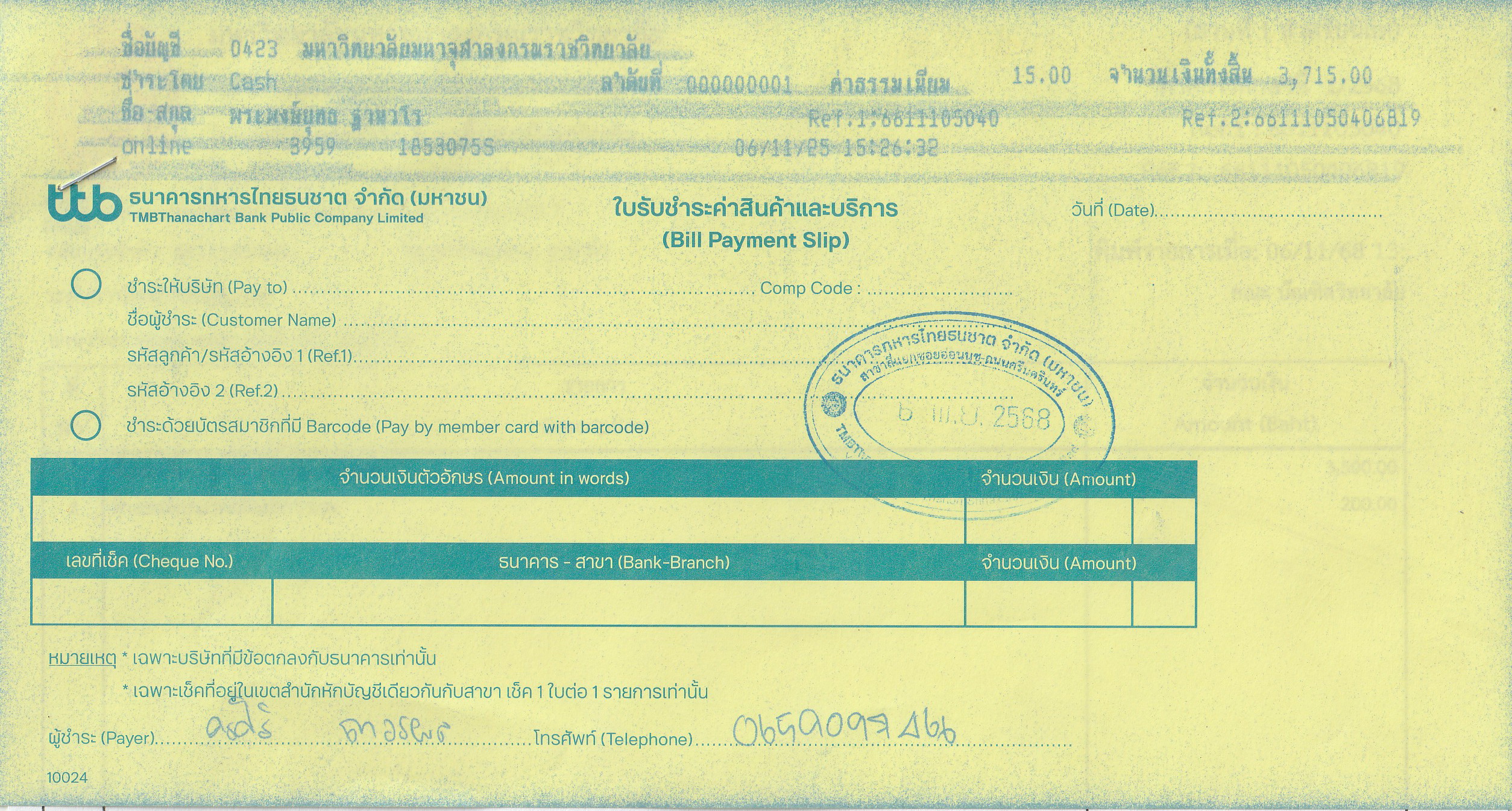 ใบเสร็จรับเงิน/เอกสารยืนยันการชำระเงิน(แนบเอกสาร)