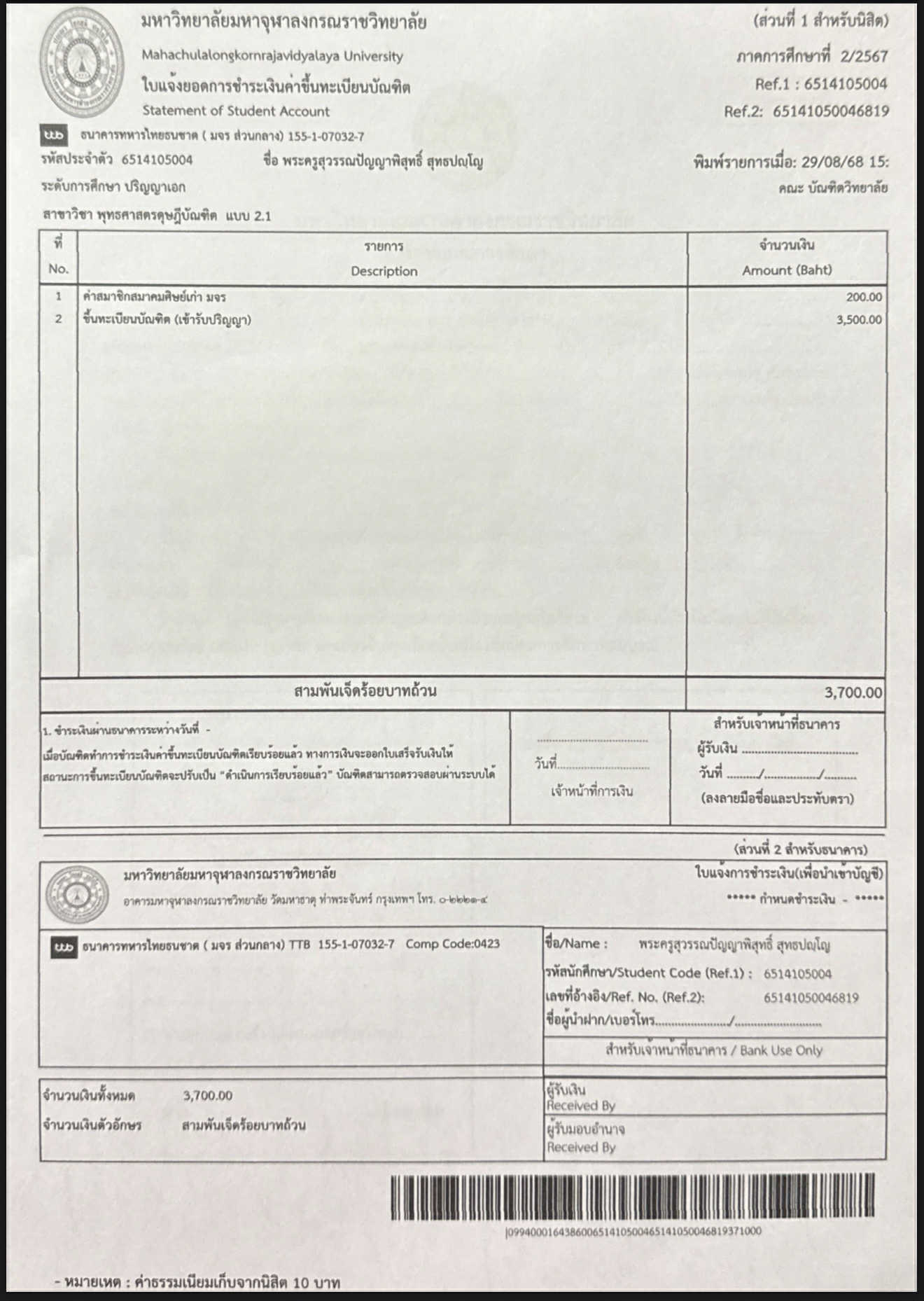 สถานะเข้าพิธีประสาทปริญญา : บรรพชิต ระดับ : ปริญญาเอก สังกัดคณะ: บัณฑิตวิทยาลัย สาขาวิชา: พุทธศาสตรดุษฎีบัณฑิต