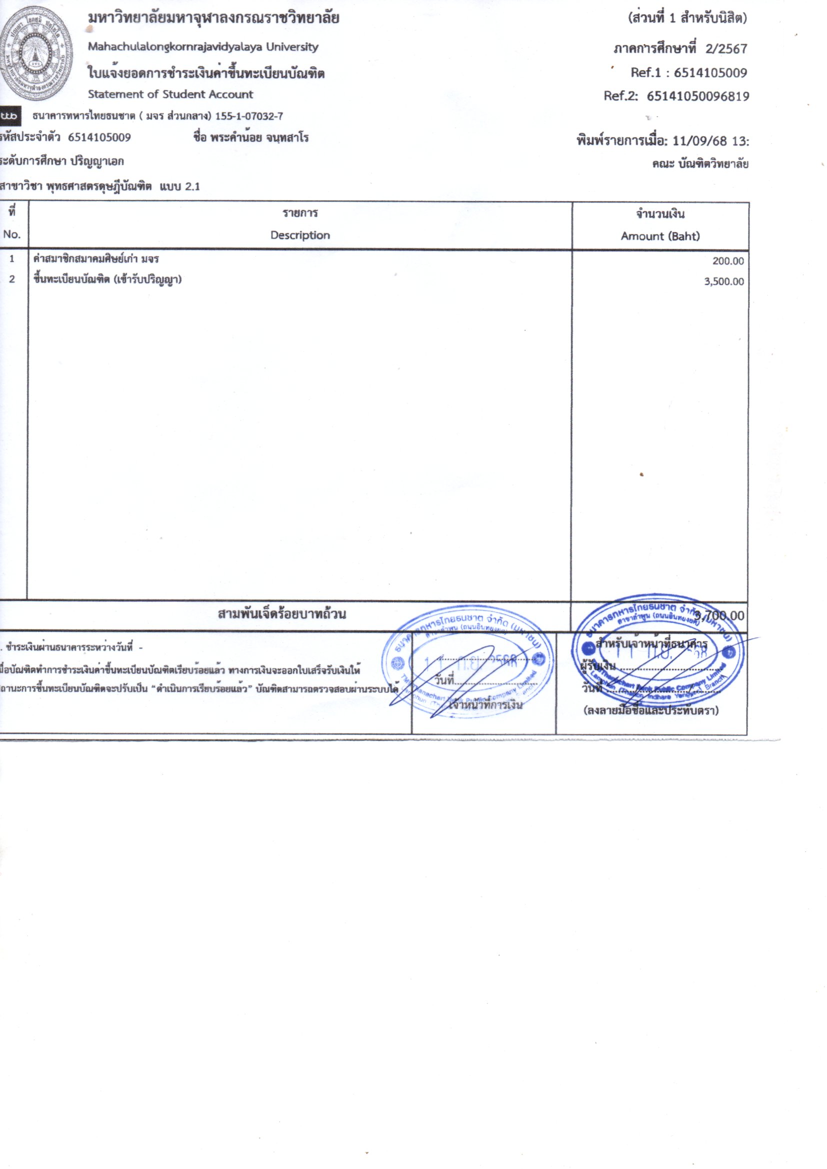 | รหัสนิสิต : 6514105009 | ชื่อ : พระคำน้อย | ฉายา: จนฺทสาโร | นามสกุล: จันทร์จาง |