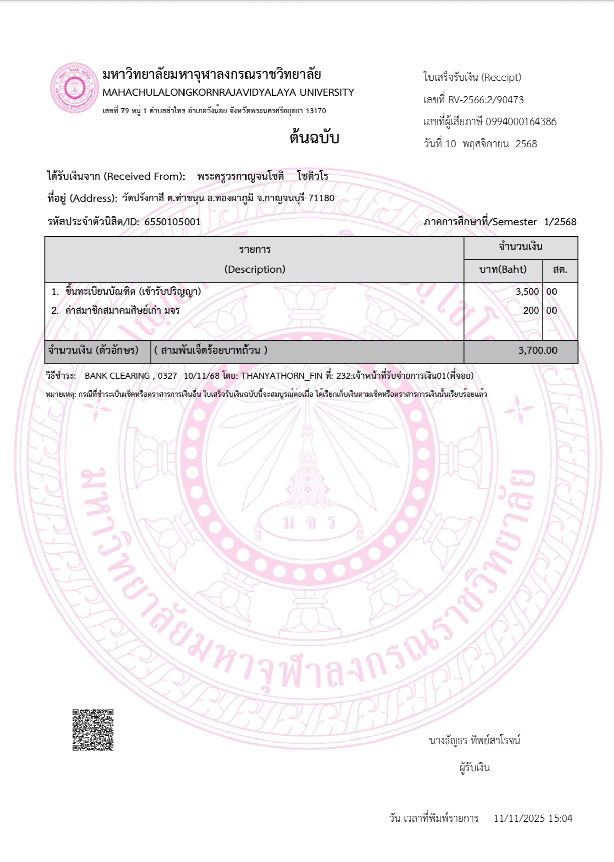 สถานะเข้าพิธีประสาทปริญญา : บรรพชิต ระดับ : ปริญญาเอก สังกัดคณะ: บัณฑิตวิทยาลัย สาขาวิชา: พระพุทธศาสนา