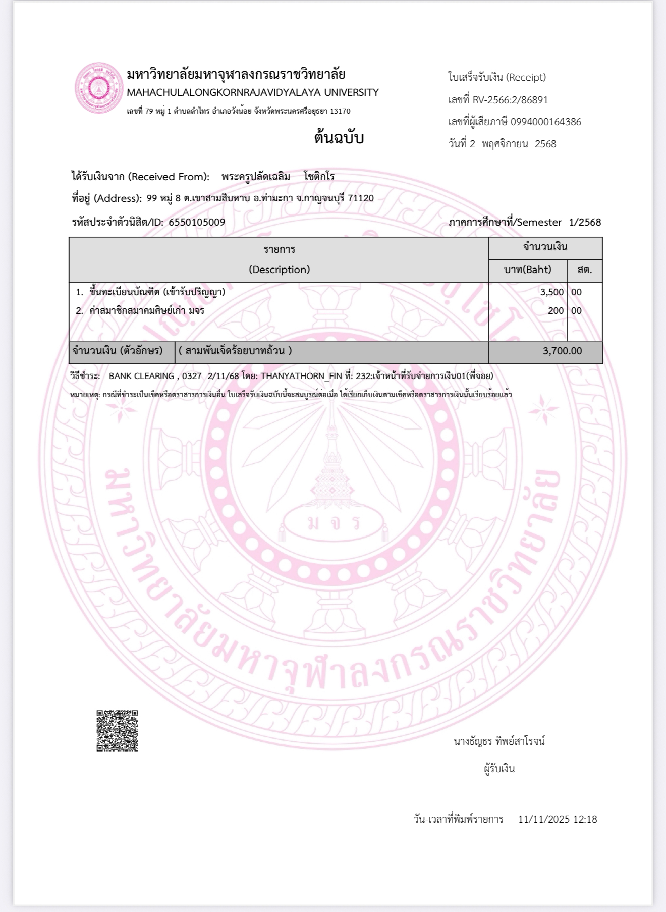 | สถานะเข้าพิธีประสาทปริญญา : บรรพชิต | ระดับ : ปริญญาเอก | สังกัดคณะ: บัณฑิตวิทยาลัย | สาขาวิชา: พระพุทธศาสนา |