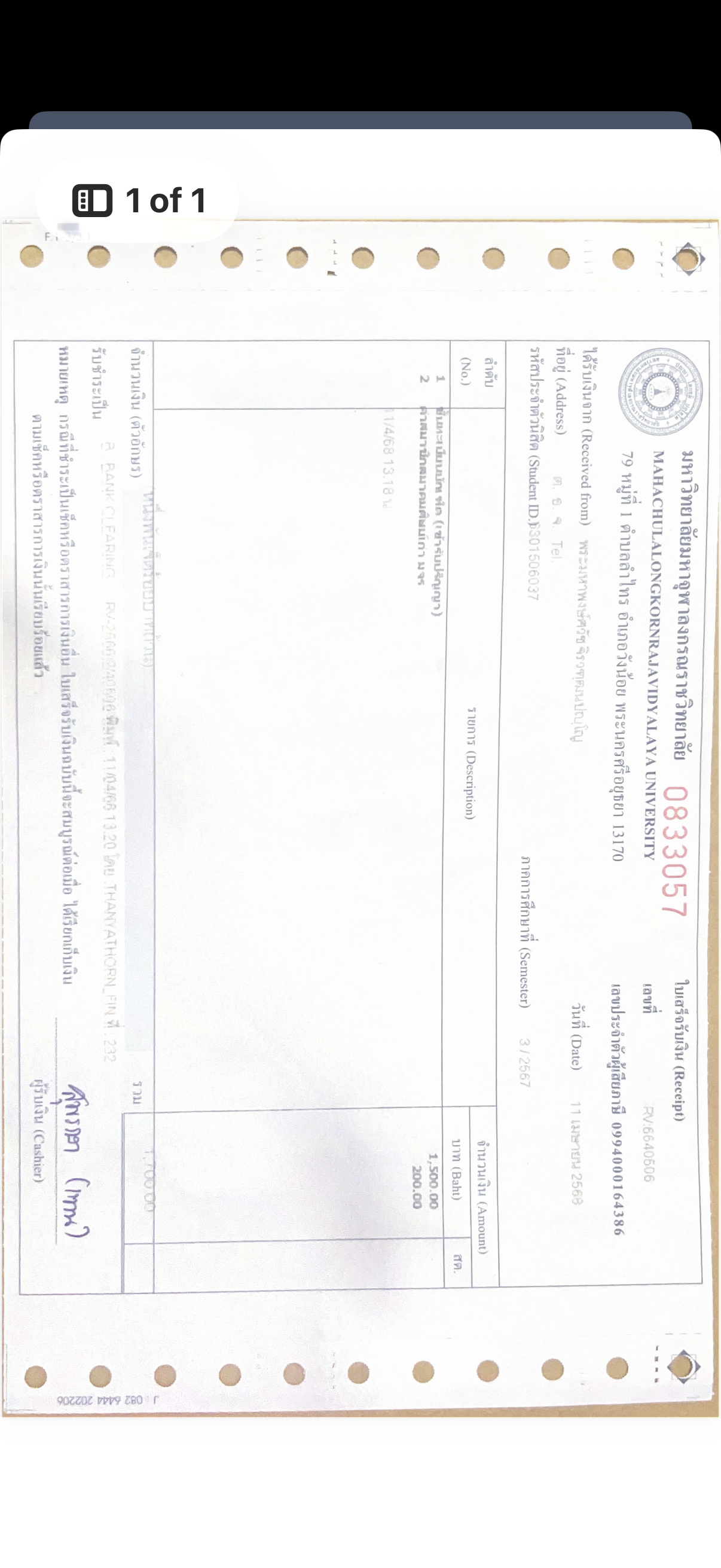 ใบเสร็จรับเงิน/เอกสารยืนยันการชำระเงิน(แนบเอกสาร)