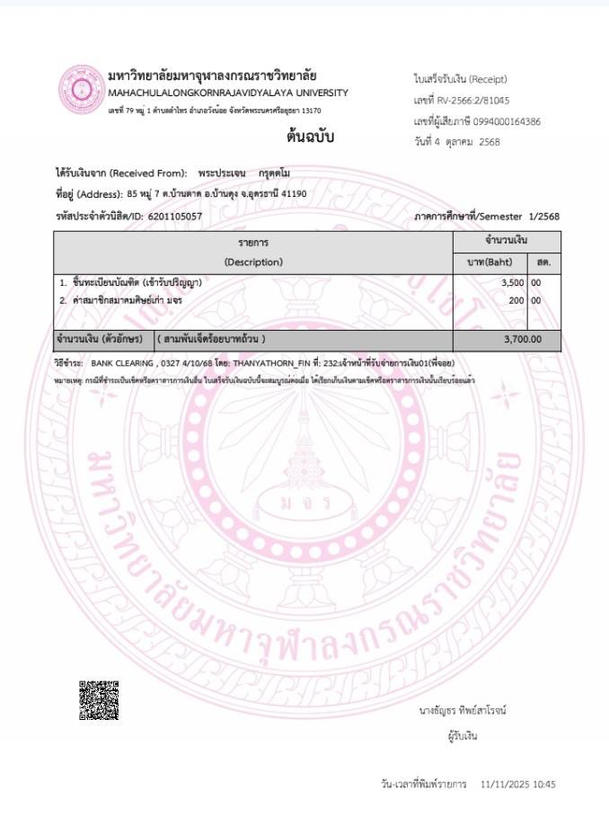 | รหัสนิสิต : 6201105057 | ชื่อ : พระประเจน | ฉายา: กรุตฺตโม | นามสกุล: ทองเหมะ |