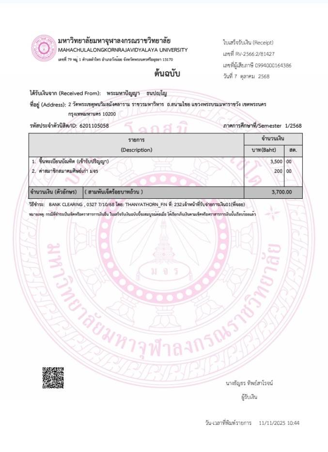 | สถานะเข้าพิธีประสาทปริญญา : บรรพชิต | ระดับ : ปริญญาเอก | สังกัดคณะ: บัณฑิตวิทยาลัย | สาขาวิชา: ปรัชญา |
