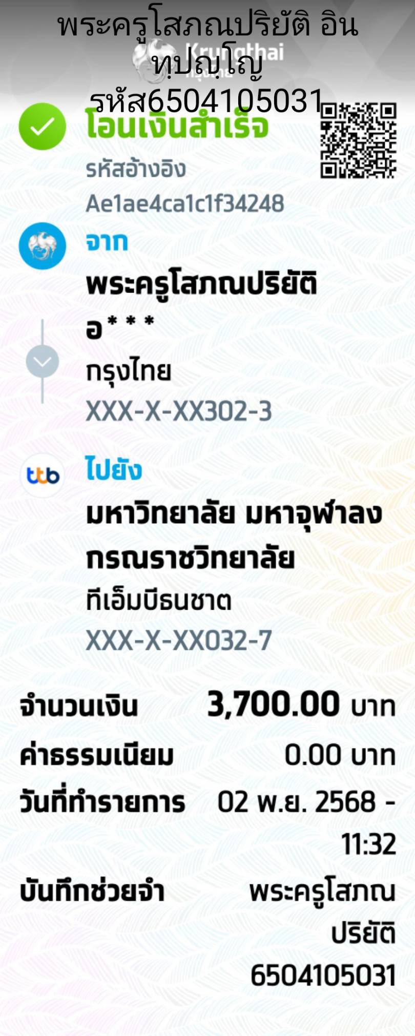 | รหัสนิสิต : 6504105031 | ชื่อ : พระครูโสภณปริยัติ | ฉายา: อินฺทปญฺโญ | นามสกุล: แก้วคำแสน |