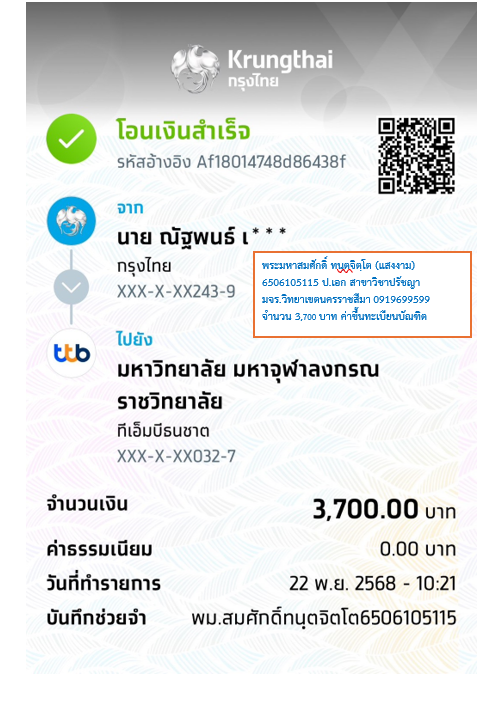 | รหัสนิสิต : 6506105115 | ชื่อ : พระมหาสมศักดิ์ | ฉายา: ทนฺตจิตฺโต | นามสกุล: แสงงาม |