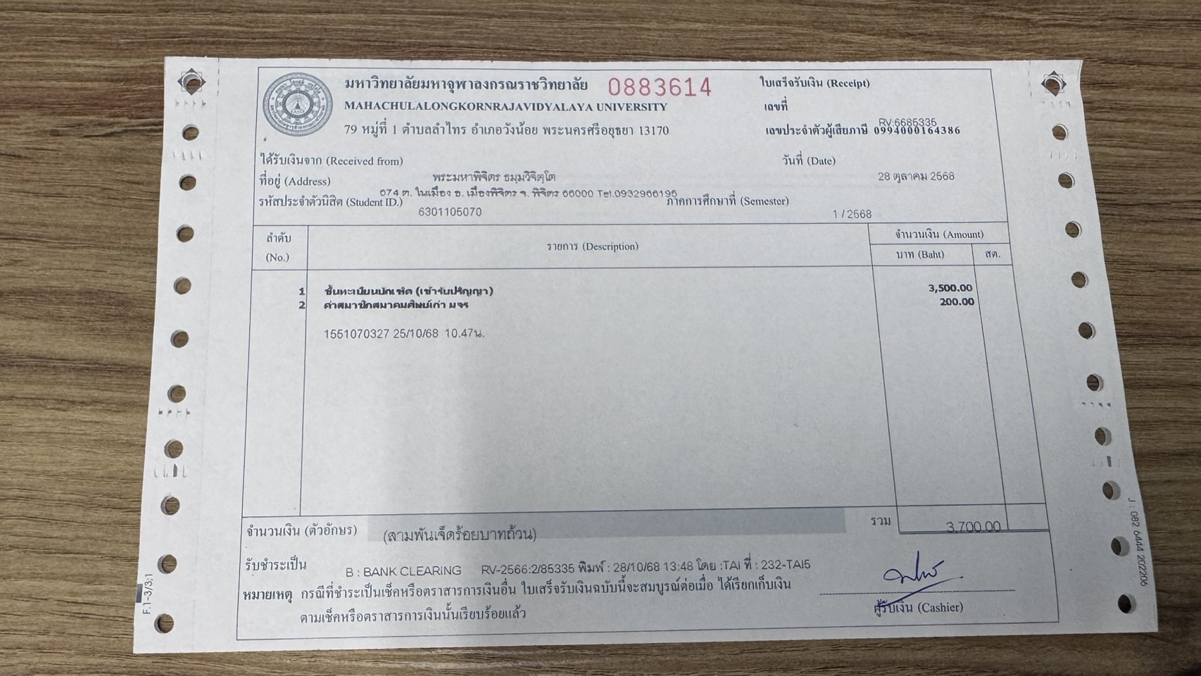 ใบเสร็จรับเงิน/เอกสารยืนยันการชำระเงิน(แนบเอกสาร)