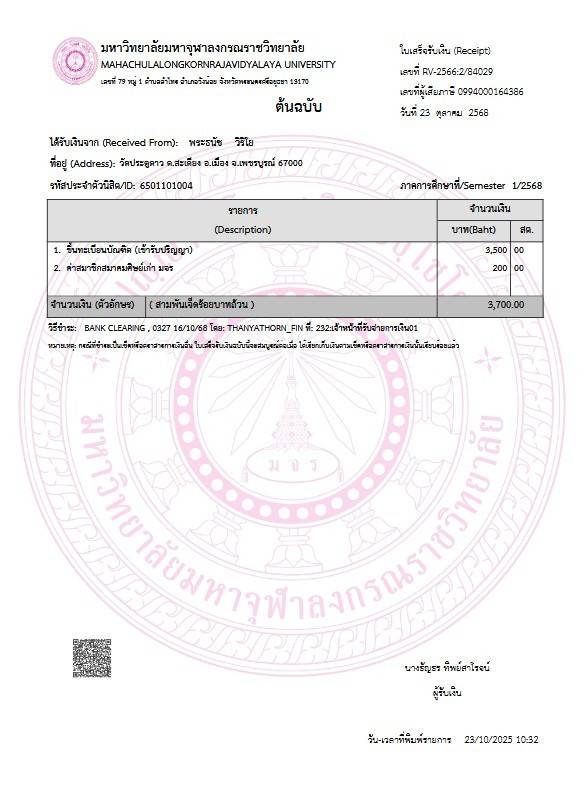 | รหัสนิสิต : 6501101004 | ชื่อ : พระธนัช | ฉายา: วิริโย | นามสกุล: รุ่งโรจน์ |
