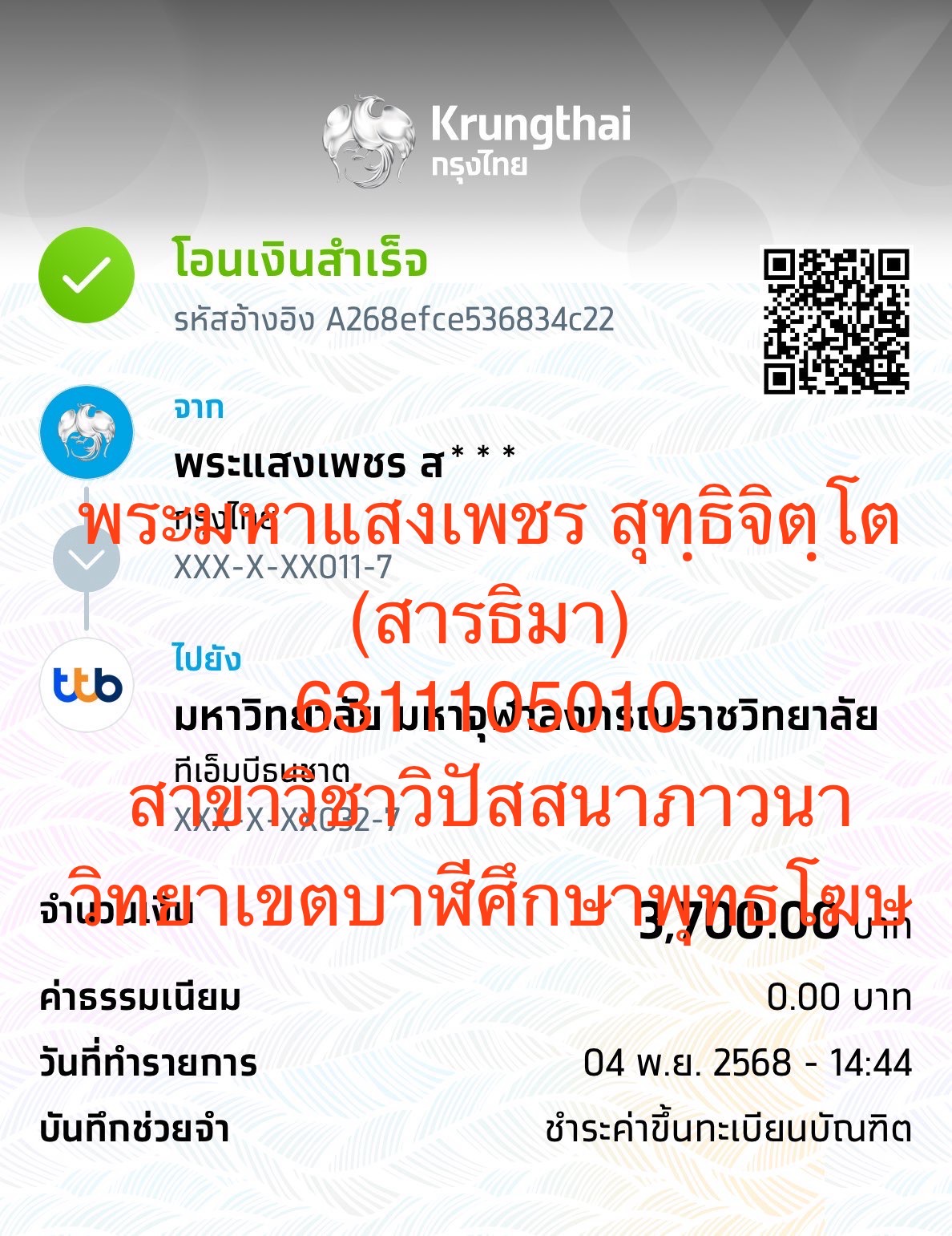 | รหัสนิสิต : 6311105010 | ชื่อ : พระมหาแสงเพชร | ฉายา: สุทฺธิจิตฺโต | นามสกุล: สารธิมา |