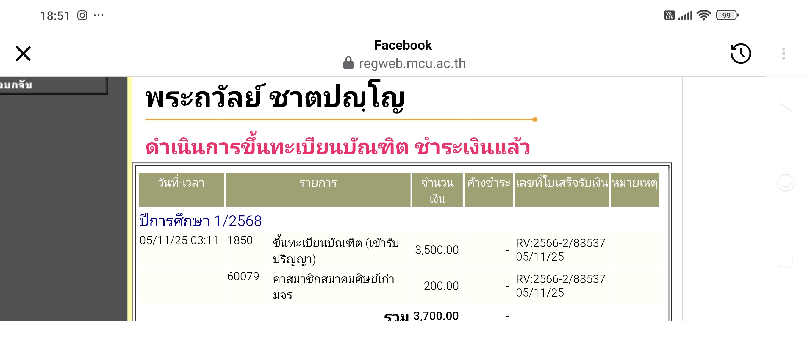 | สถานะเข้าพิธีประสาทปริญญา : บรรพชิต | ระดับ : ปริญญาเอก | สังกัดคณะ: บัณฑิตวิทยาลัย | สาขาวิชา: วิปัสสนาภาวนา |