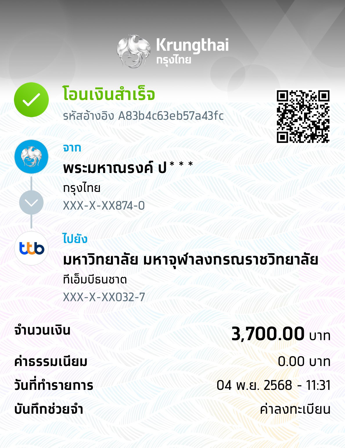 QR Code สำหรับสแกนเข้าร่วมพิธี * เข้าพิธีประสาทปริญญาวันที่ 7 ธันวาคม 2568 |