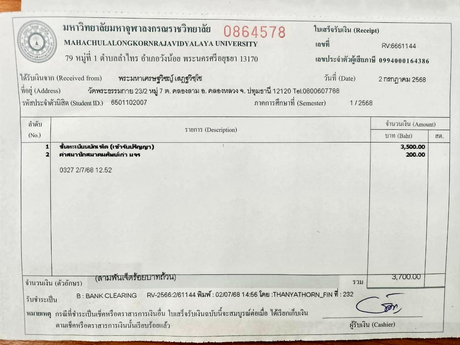 | รหัสนิสิต : 6501102007 | ชื่อ : พระมหาเศรษฐวิชญ์ | ฉายา: เสฏฺฐวิชฺโช | นามสกุล: ถิระศรุตานันท์ |