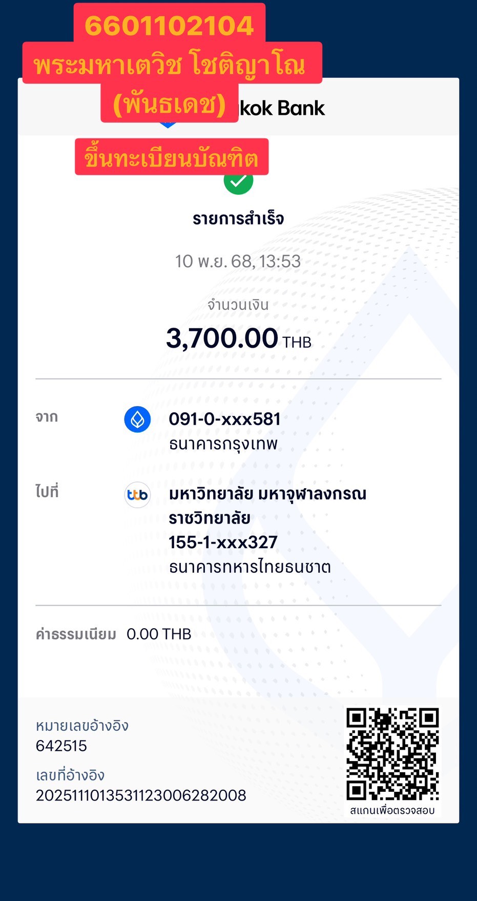 | รหัสนิสิต : 6601102104 | ชื่อ : พระมหาเตวิช | ฉายา: โชติญาโณ | นามสกุล: พันธเดช |