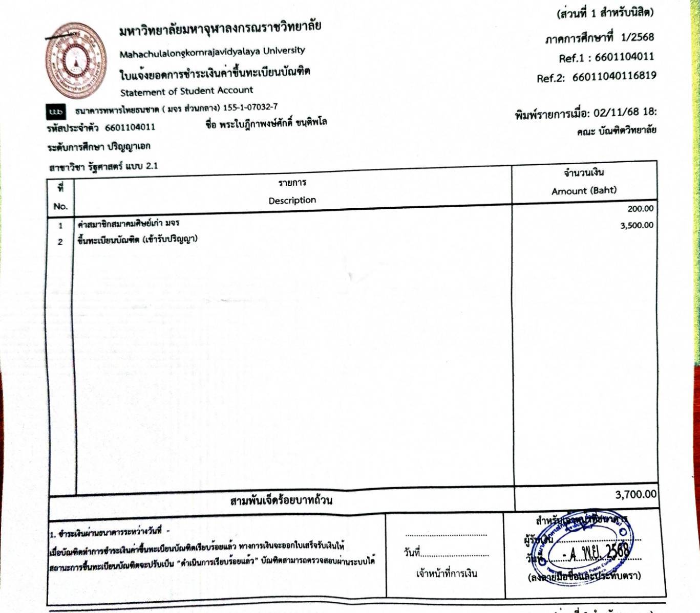 | รหัสนิสิต : 6601104011 | ชื่อ : พระใบฎีกาพงษ์ศักดิ์ | ฉายา: ขนฺติพโล | นามสกุล: รอดทะยอย |