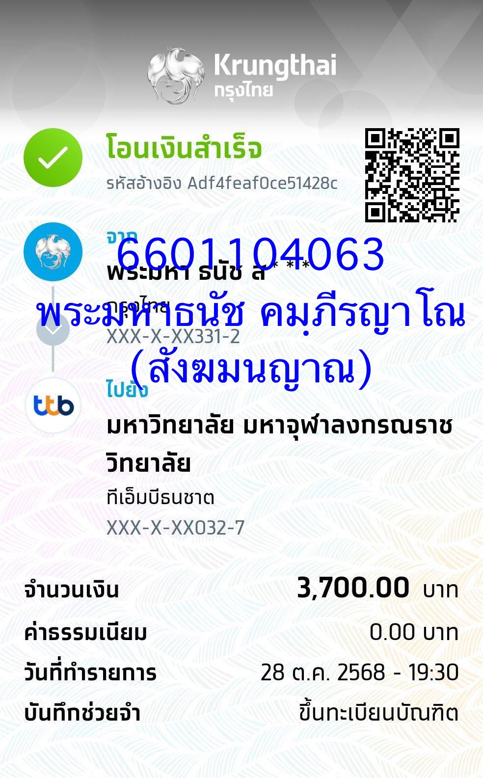 | รหัสนิสิต : 6601104063 | ชื่อ : พระมหาธนัช | ฉายา: คมฺภีรญาโณ | นามสกุล: สังฆมนญาณ |