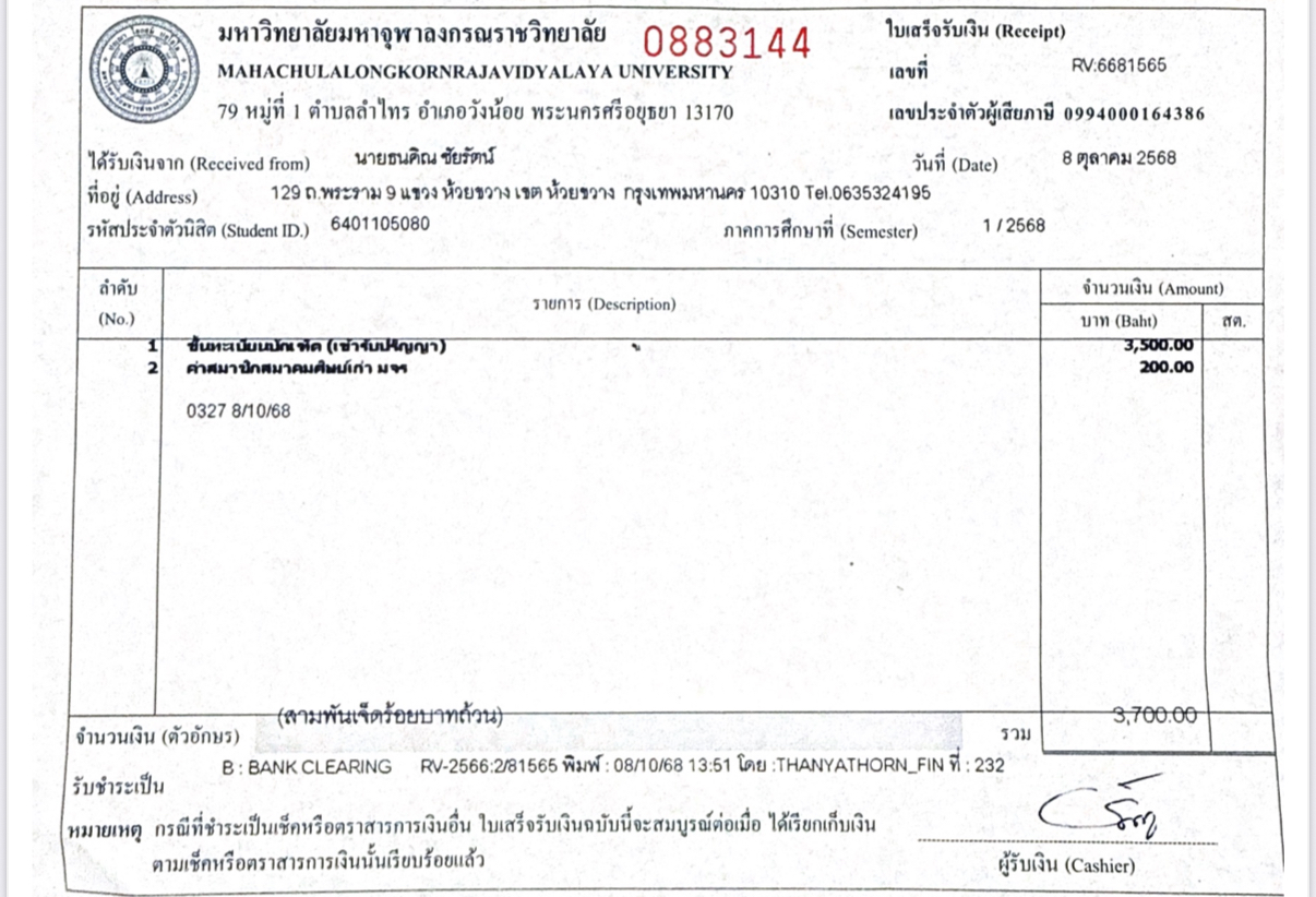 | รหัสนิสิต : 6401105080 | ชื่อ : นายธนคิณ | ฉายา: - | นามสกุล: ชัยรัตน์ |