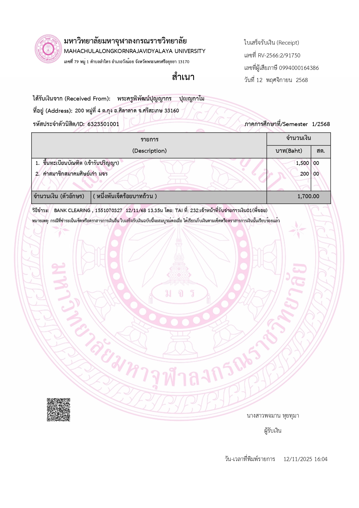 | รหัสนิสิต : 6323501001 | ชื่อ : พระครูพิพัฒน์ปุญญากร | ฉายา: ปุญฺญกาโม | นามสกุล: สายสา |