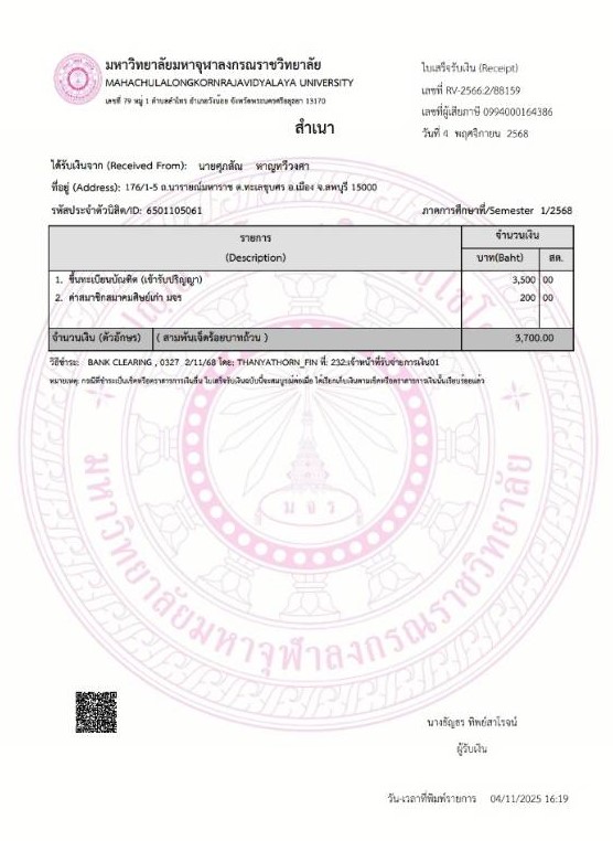 ใบเสร็จรับเงิน/เอกสารยืนยันการชำระเงิน(แนบเอกสาร)
