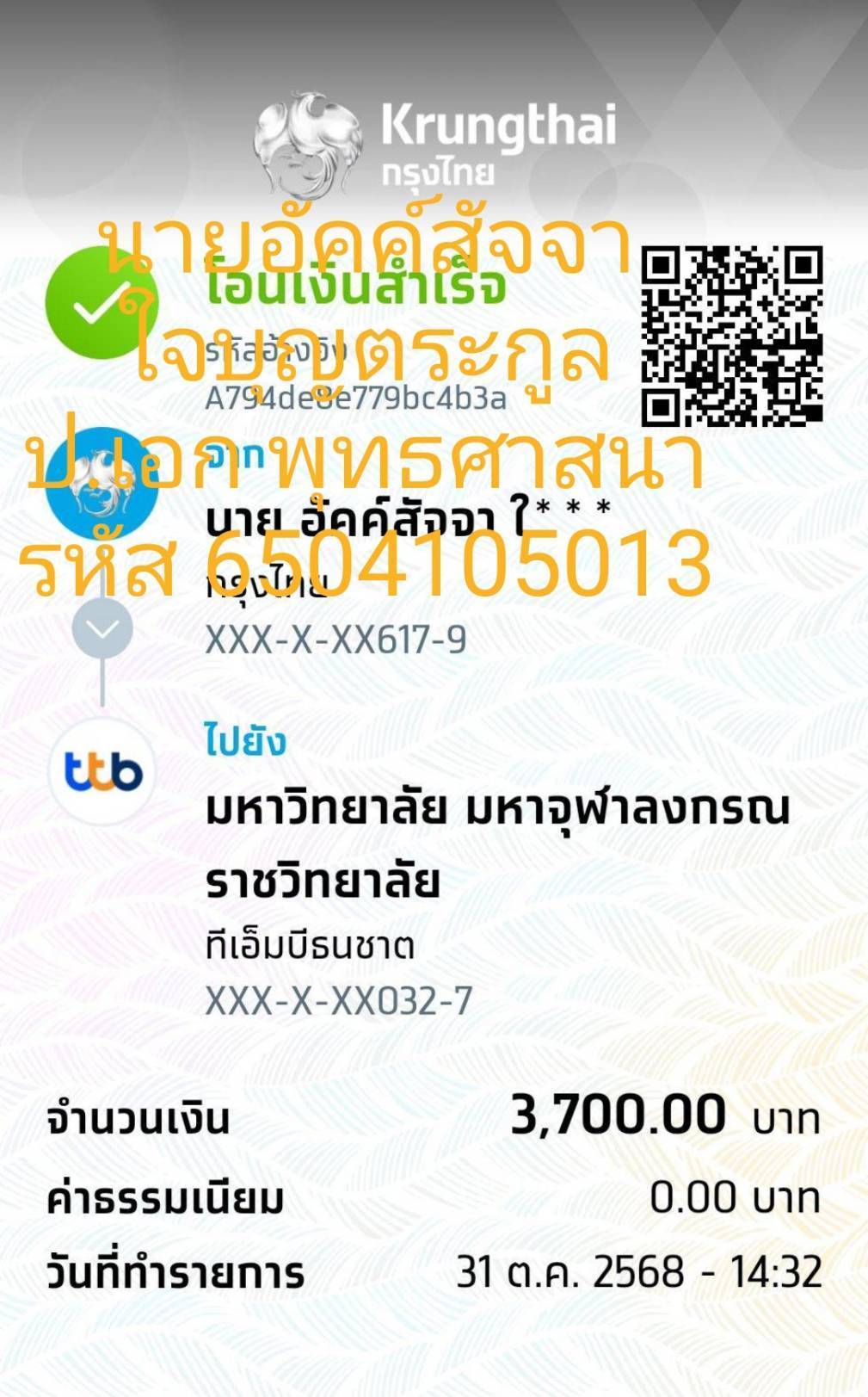 | รหัสนิสิต : 6504105013 | ชื่อ : นายอัคค์สัจจา | ฉายา: - | นามสกุล: ใจบุญตระกูล |