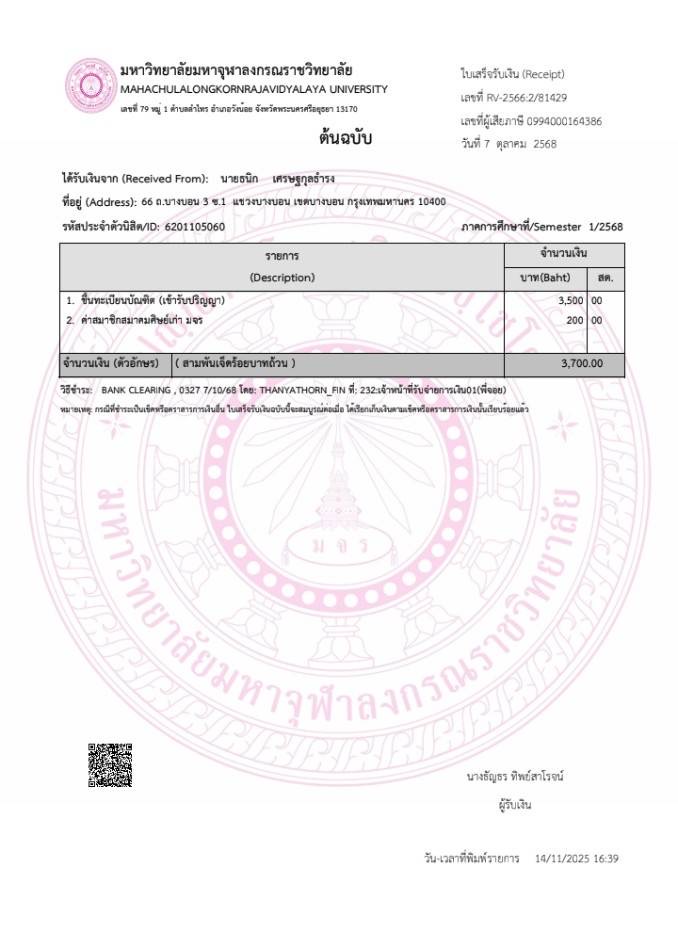 ใบเสร็จรับเงิน/เอกสารยืนยันการชำระเงิน(แนบเอกสาร)