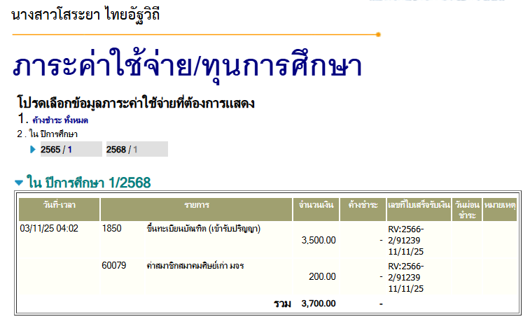| รหัสนิสิต : 6506105110 | ชื่อ : นางสาวโสระยา | ฉายา: - | นามสกุล: ไทยอัฐวิถี |