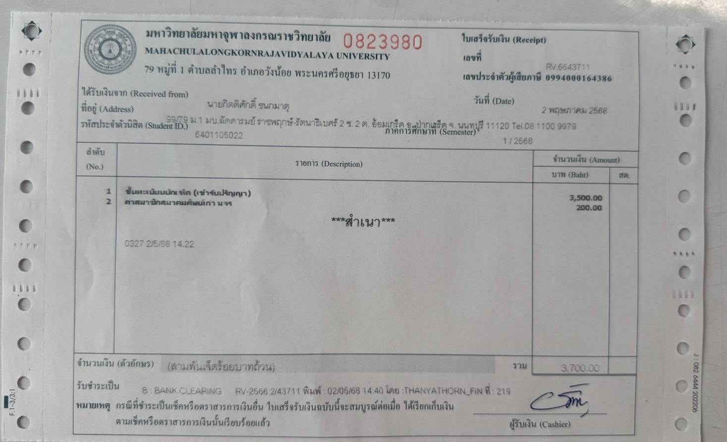 | รหัสนิสิต : 6401105022 | ชื่อ : นายกิตติศักดิ์ | ฉายา: - | นามสกุล: ชนกมาตุ |