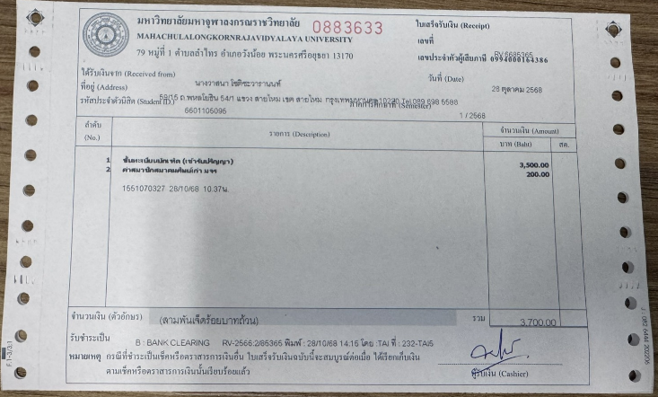 ใบเสร็จรับเงิน/เอกสารยืนยันการชำระเงิน(แนบเอกสาร)