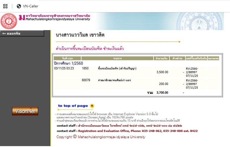 | รหัสนิสิต : 6503102008 | ชื่อ : นางสาวแวววิมล | ฉายา: - | นามสกุล: เชาวลิต |