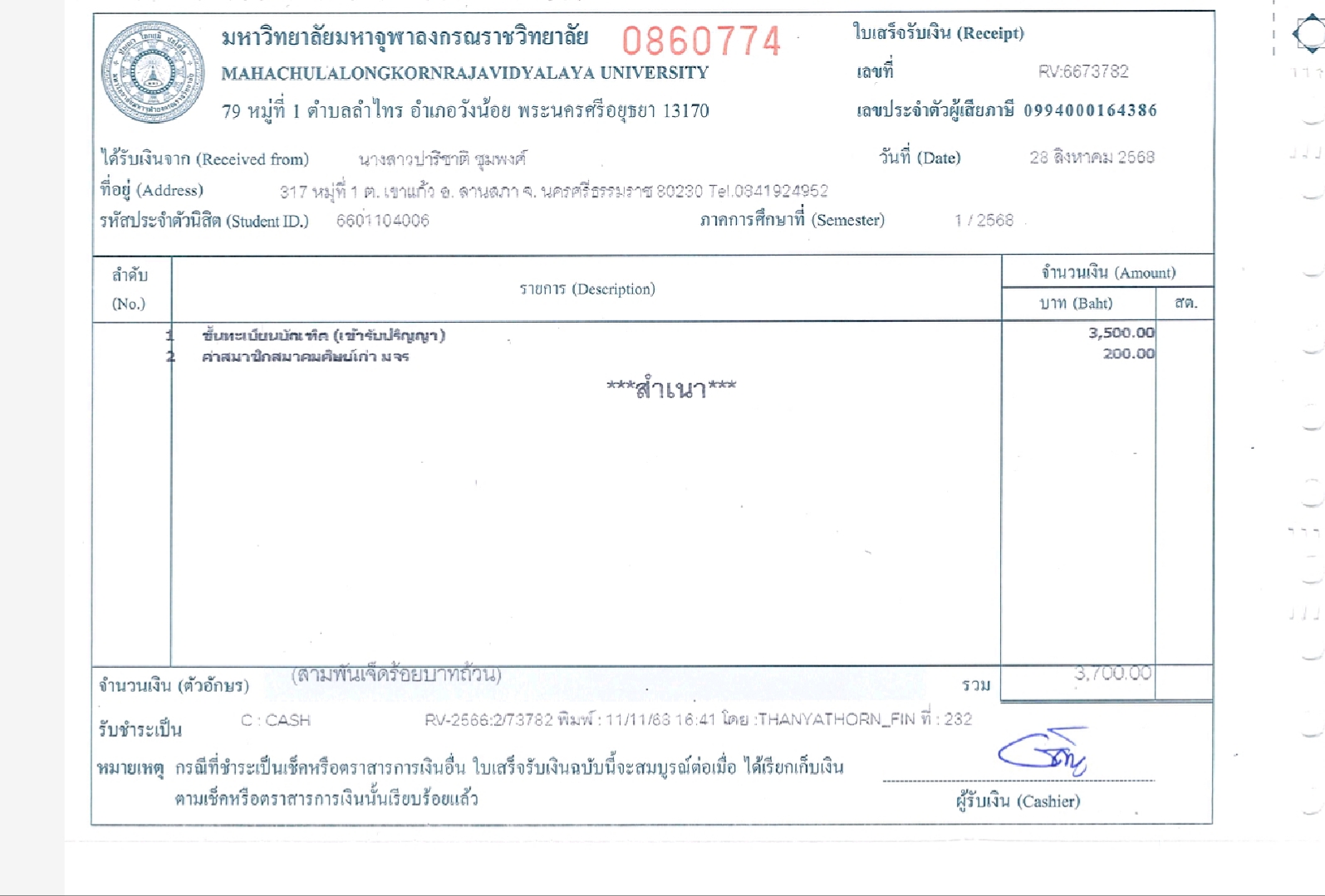 ใบเสร็จรับเงิน/เอกสารยืนยันการชำระเงิน(แนบเอกสาร)