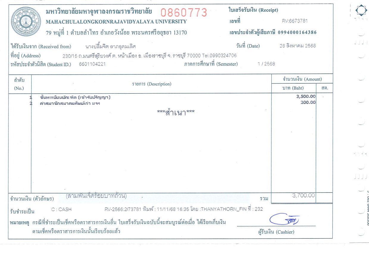 ใบเสร็จรับเงิน/เอกสารยืนยันการชำระเงิน(แนบเอกสาร)