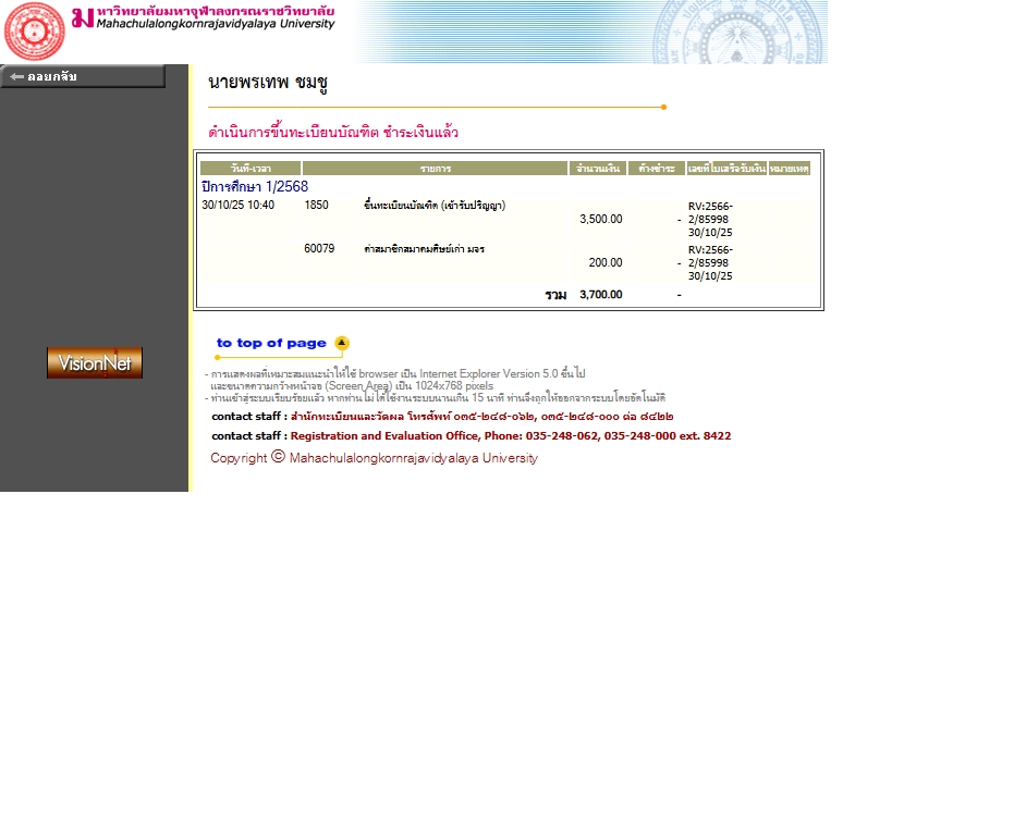 | รหัสนิสิต : 6650104017 | ชื่อ : นายพรเทพ | ฉายา: - | นามสกุล: ชมชู |