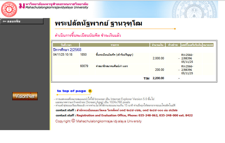สถานะเข้าพิธีประสาทปริญญา : บรรพชิต ระดับ : ปริญญาโท สังกัดคณะ: บัณฑิตวิทยาลัย สาขาวิชา: พุทธศาสตรมหาบัณฑิต