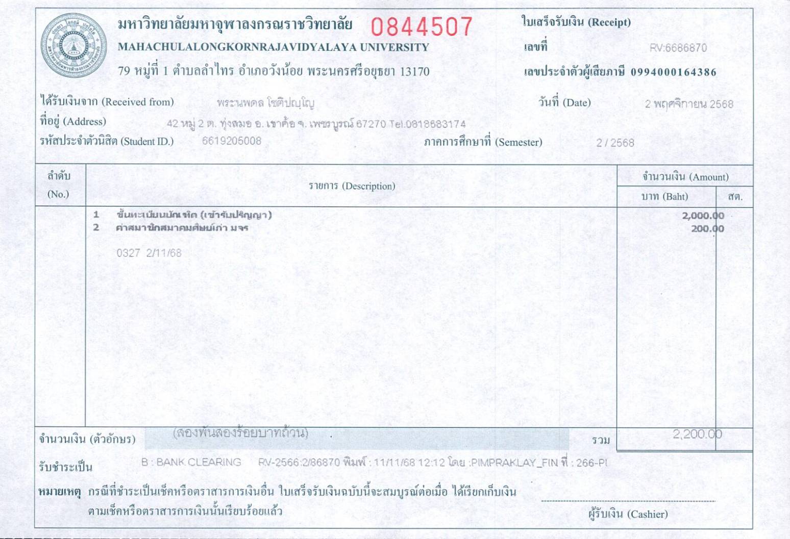 ใบเสร็จรับเงิน/เอกสารยืนยันการชำระเงิน(แนบเอกสาร)