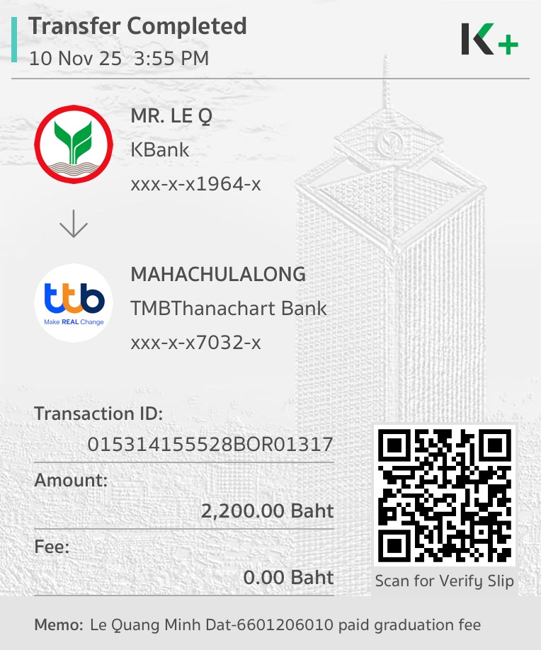 | รหัสนิสิต : 6601206010 | ชื่อ : Le Quang Minh Dat | ฉายา: - | นามสกุล: - |
