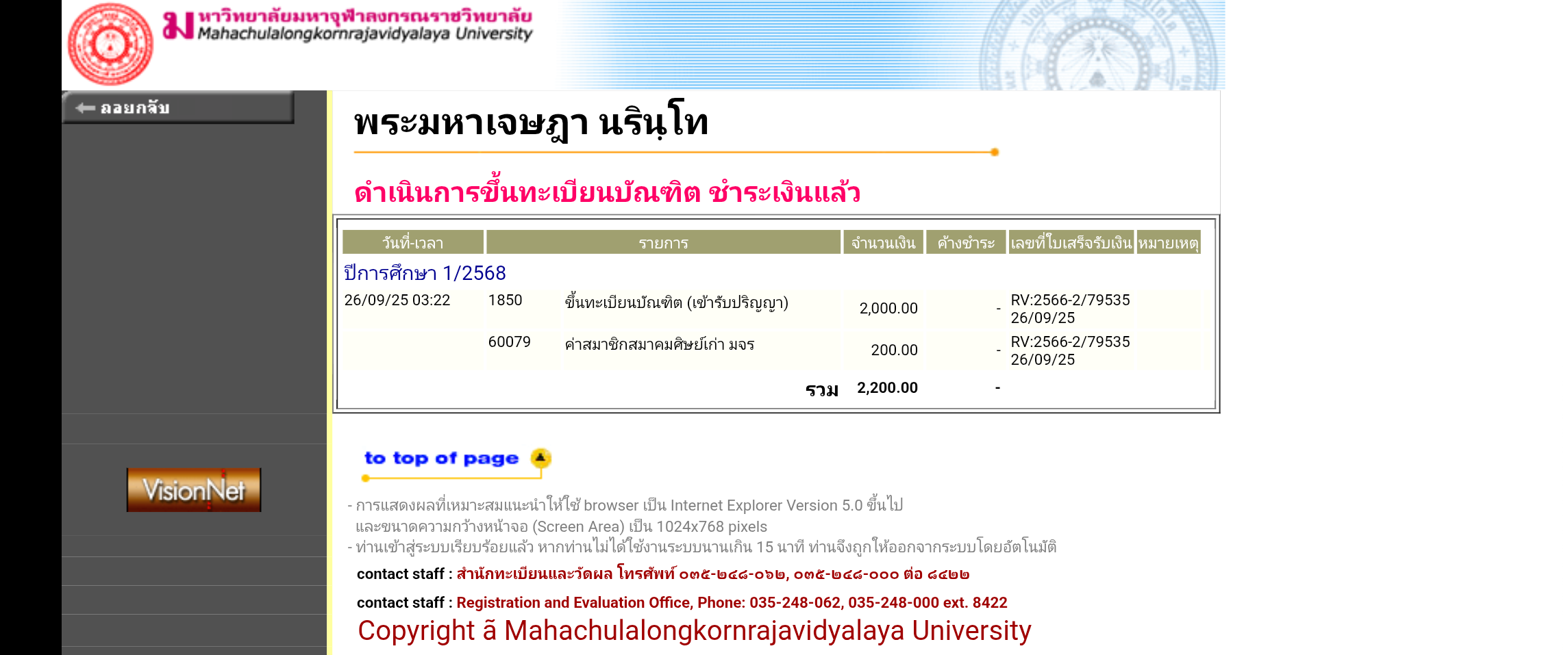 สถานะเข้าพิธีประสาทปริญญา : บรรพชิต ระดับ : ปริญญาโท สังกัดคณะ: บัณฑิตวิทยาลัย สาขาวิชา: พุทธนวัตกรรมการสื่อสาร