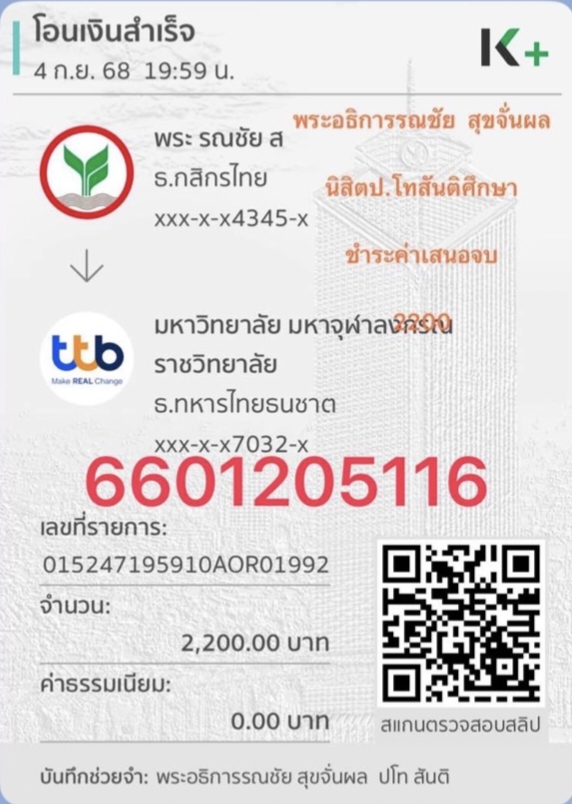 | รหัสนิสิต : 6601205116 | ชื่อ : พระอธิการรณชัย | ฉายา: รณญฺชโย | นามสกุล: สุขจั่นผล |
