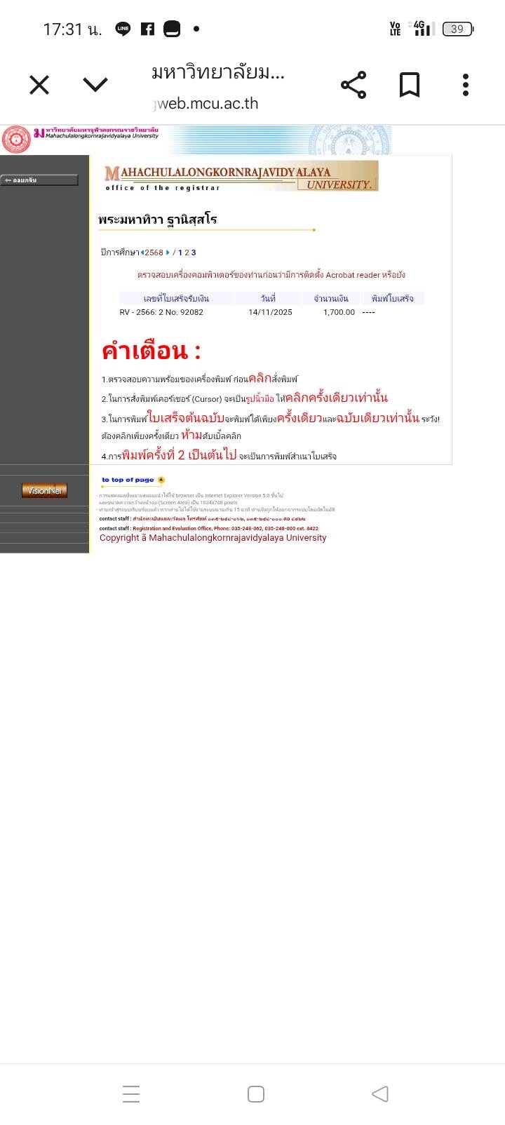 | สถานะเข้าพิธีประสาทปริญญา : บรรพชิต | ระดับ : ปริญญาตรี | สังกัดคณะ: คณะพุทธศาสตร์ | สาขาวิชา: วิปัสสนาภาวนา |