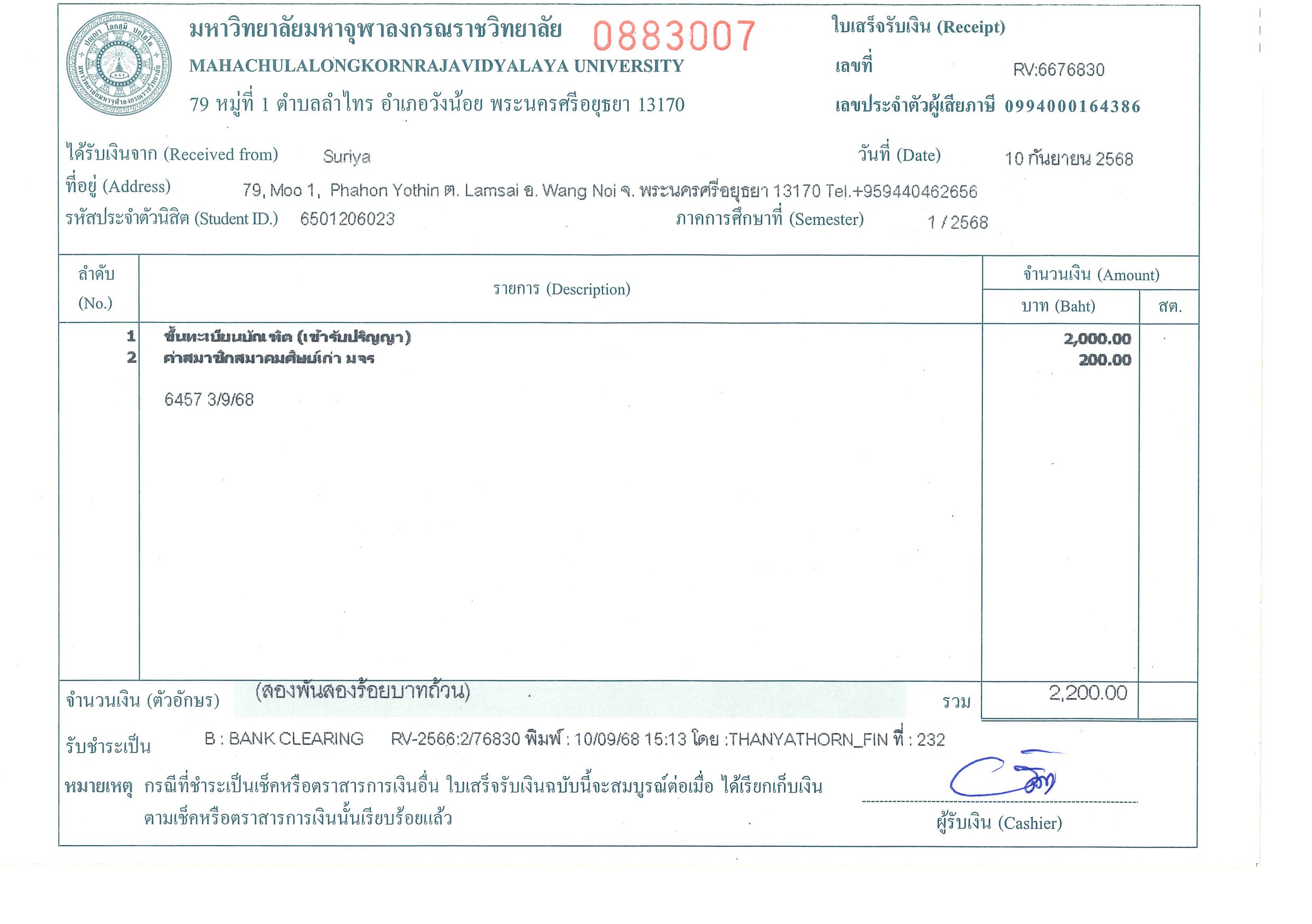 ใบเสร็จรับเงิน/เอกสารยืนยันการชำระเงิน(แนบเอกสาร)
